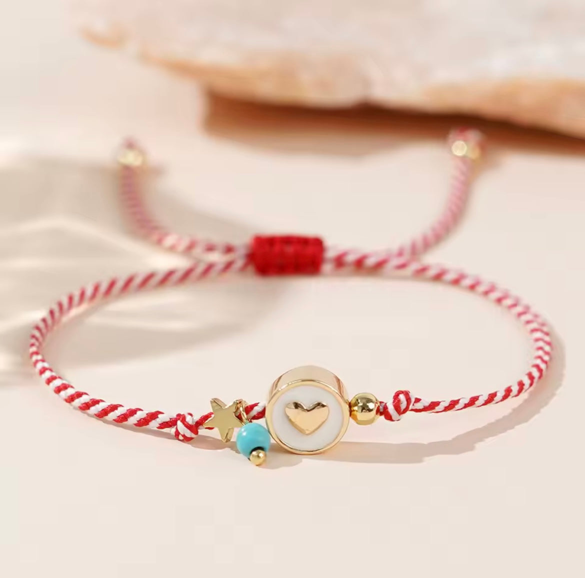 Červeno‑bílý náramek inspirovaný řeckou tradicí „March Bracelets“ – symbolizuje nový začátek, vitalitu a ochranu. Jemný provázek nese zlaté srdce – připomínku lásky, hvězdičku pro štěstí a tyrkysový korálek, který dodává hravý dotek.